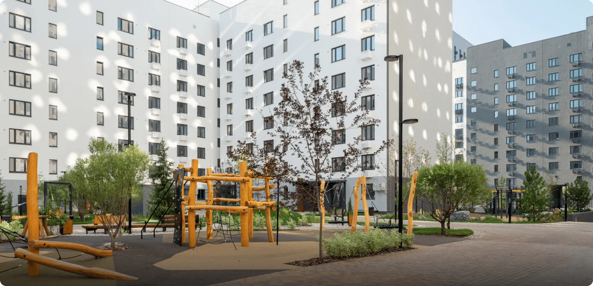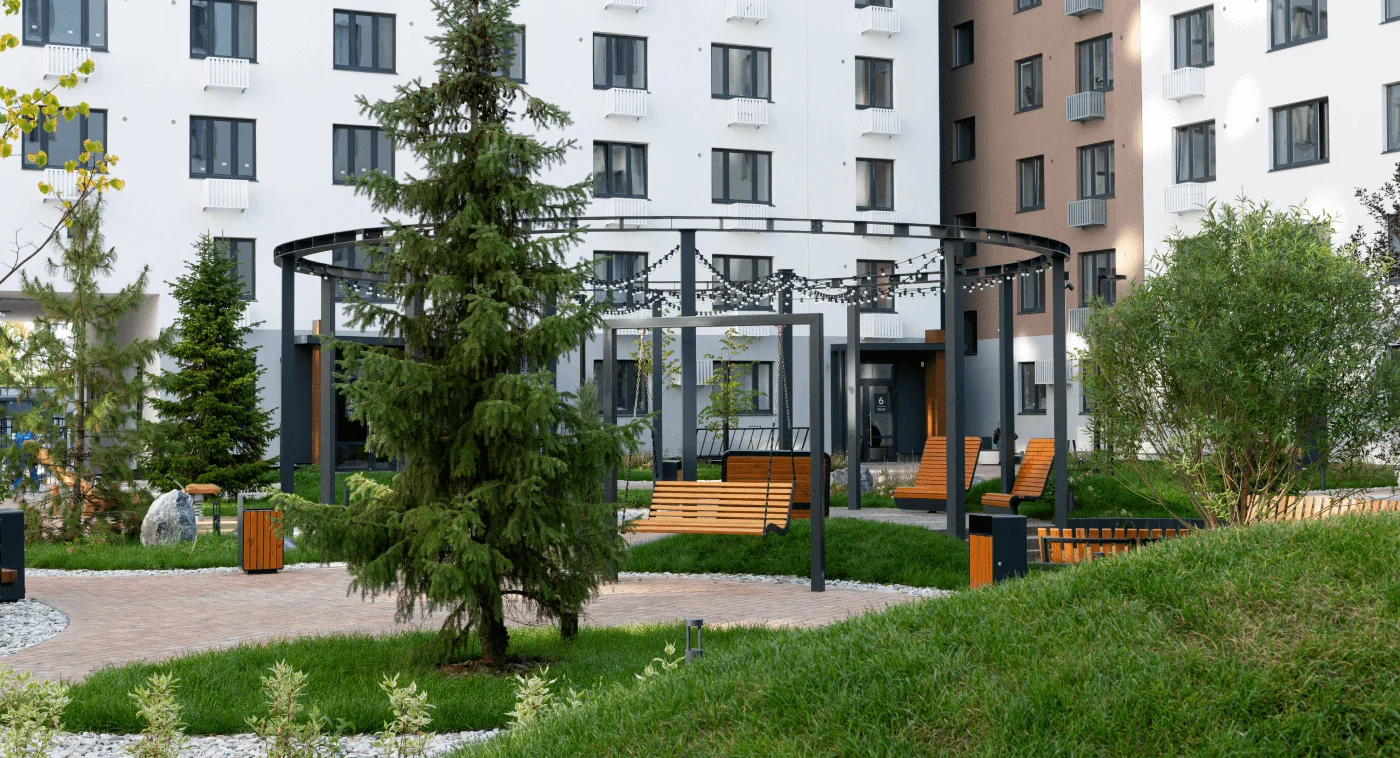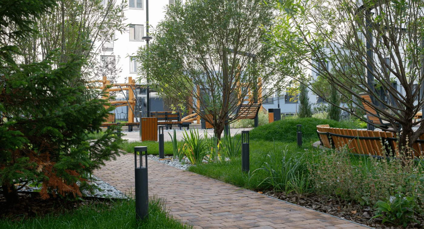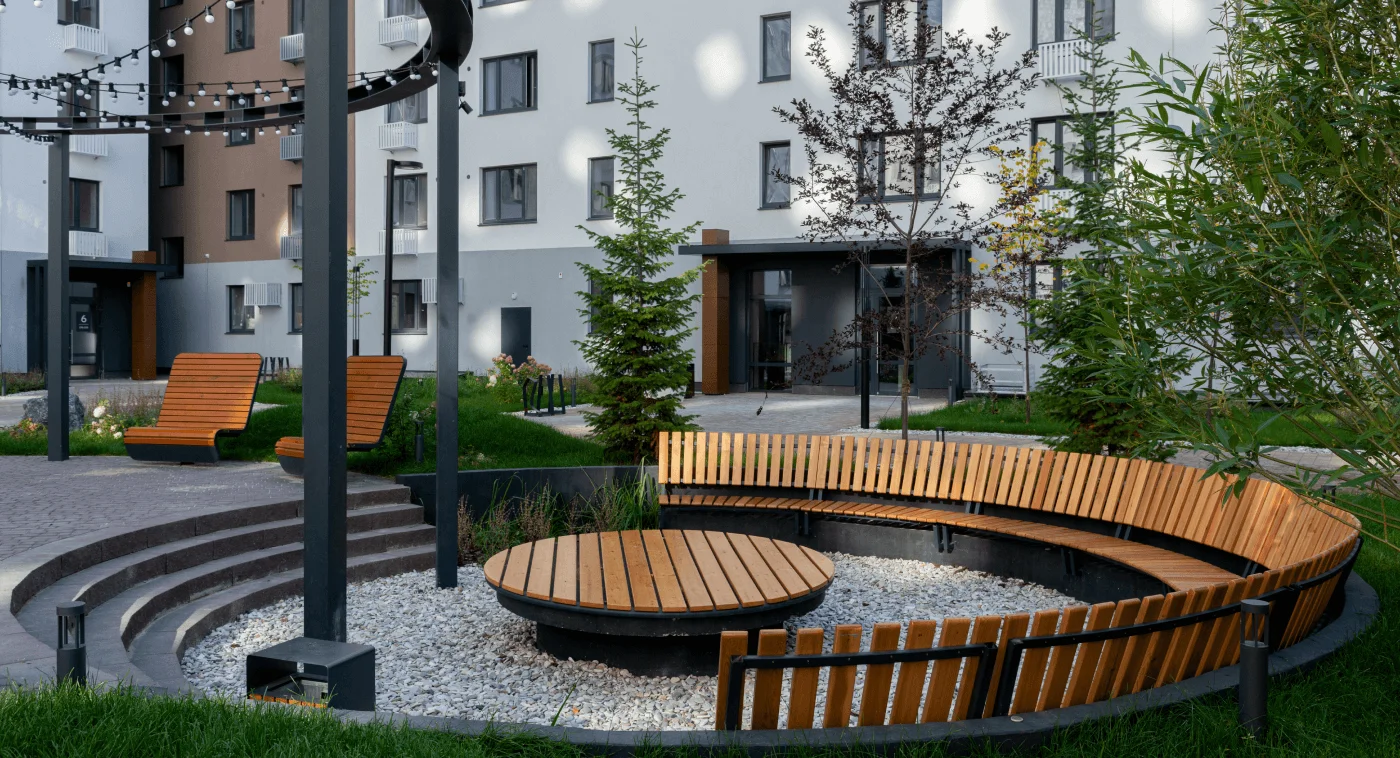 На таких будет интересно и взрослым. Для спокойного отдыха поставим удобные скамейки в тени деревьев.